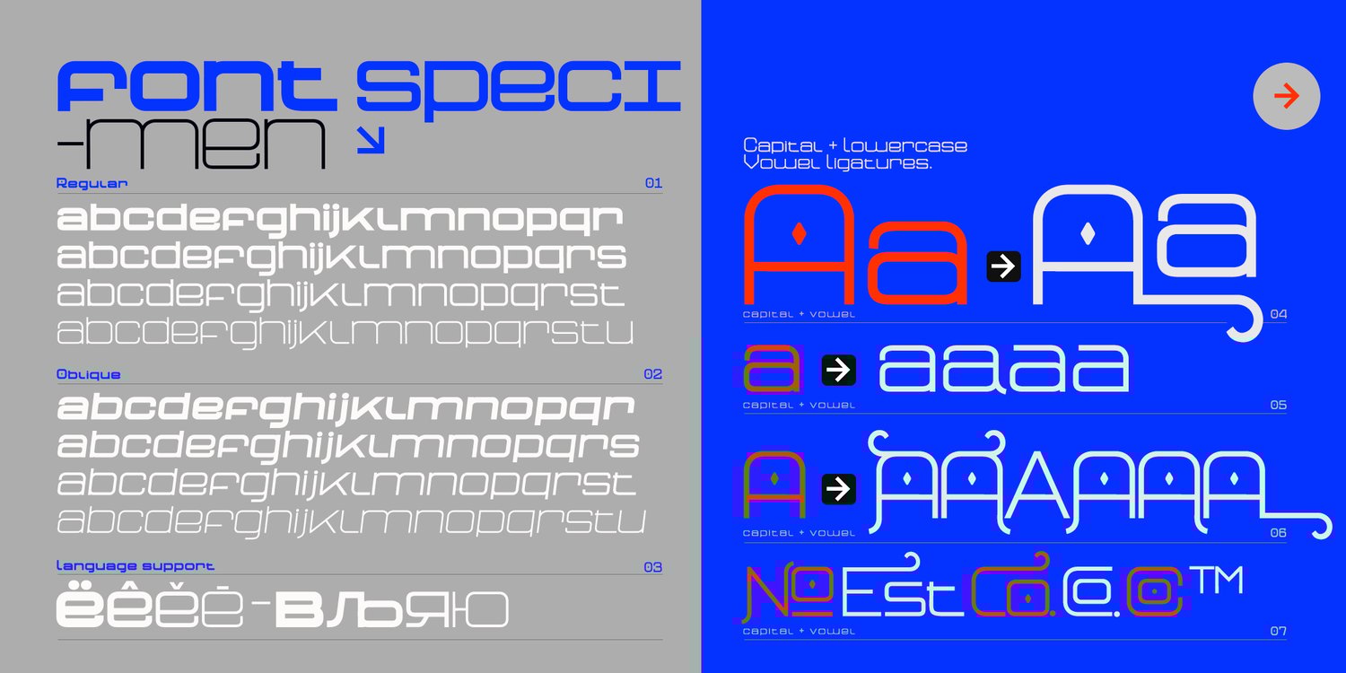 Staying true to its roots, Neo Afrique Pro emerged from the desire to blend two distinct aesthetics. It harmoniously fuses the geometric Neo-Futuristic style with the ornate decorative forms inspired by Art Nouveau and the later Lubalinesque aesthetics.